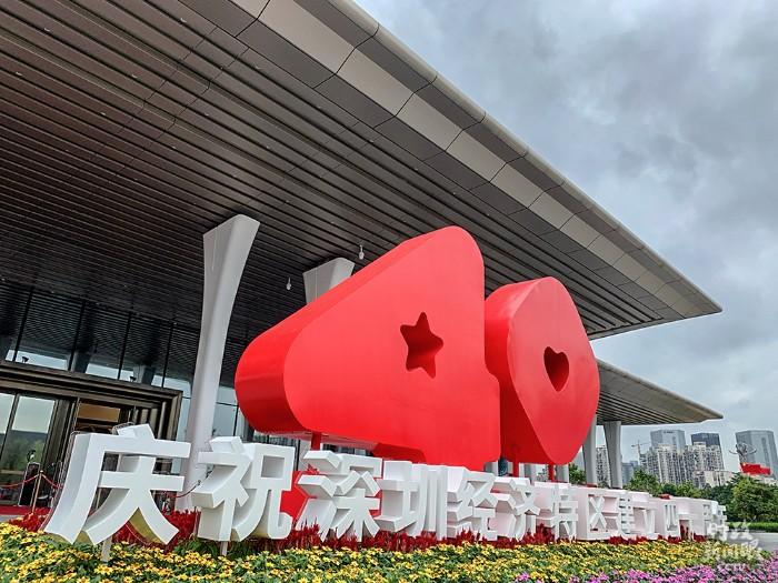△“40”是庆祝大会当天最醒目、设计最独特的数字。4里面是一颗五角星,取自五星红旗,0里面是一颗爱心,这个标识的名字叫做“星心相映”,寓意着深圳是一颗明日之星,也是一座爱心之城。(总台央视记者程铖拍摄)