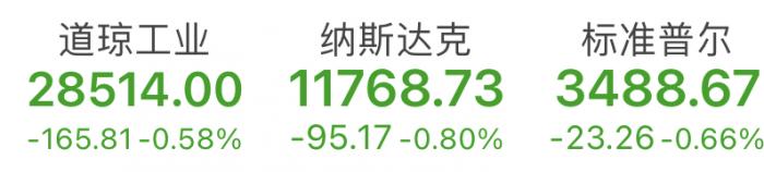 美国东部时间10月14日,财政刺激谈判继续陷入僵局以及银行股财报喜忧参半的消息令三大股指再度下跌。截至收盘,道琼斯工业平均指数跌0.58%,报28514.00点;纳斯达克综合指数跌0.80%,报11768.73点;标普500指数跌0.66%,报3488.67点。