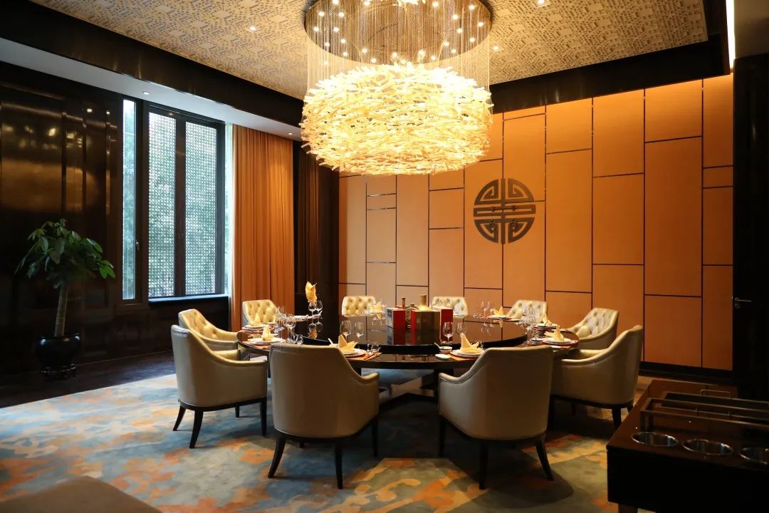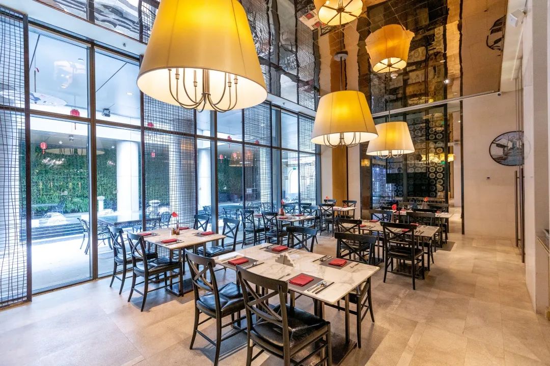 橘暮餐厅位于酒店负一层,整齐排列的桌椅间穿插着各种中式装饰,挑高的屋顶上垂下的明黄色吊灯点亮了整个空间,在斑驳的光影变化中,你可以从超大玻璃窗内欣赏到长江路街景,领略南京风情。