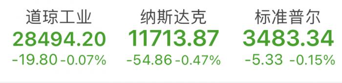 美国东部时间10月15日,美国新一轮财政刺激计划或无法在11月大选之前通过,美股三大股指出现“三连跌”。截至收盘,道琼斯工业平均指数跌0.07%,报28494.20点;纳斯达克综合指数跌0.47%,报11713.87点;标普500指数跌0.15%,报3483.34点。