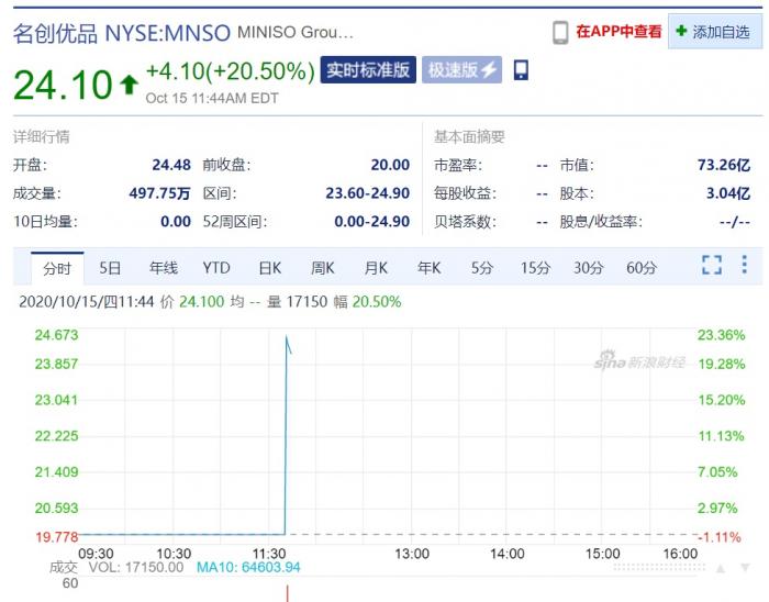 北京时间10月15日晚,中国最大“10元店”名创优品(NYSE: MNSO)正式登陆纽交所,定价20美元,高于此前的发行区间上限,总发行3040万股ADS,连同超额配售权发行股份,市值达69.92亿美元。