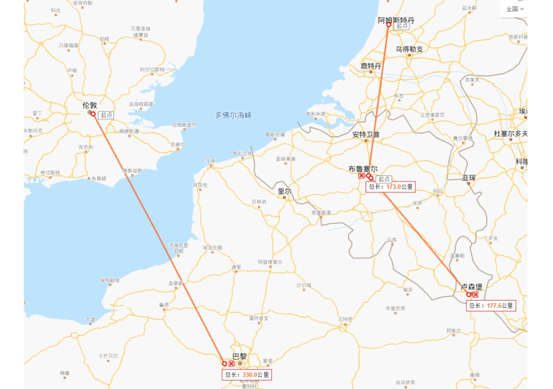 布鲁塞尔到卢森堡,或者是布鲁塞尔到阿姆斯特丹之间,直线距离是180公里左右,但同样跨越了国境。