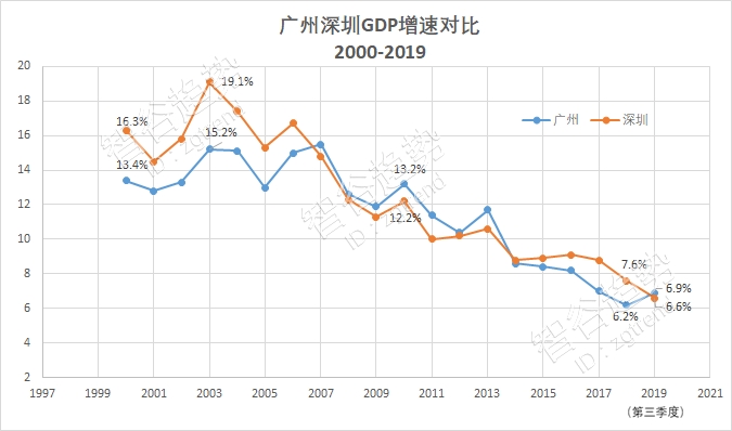 从2000年开始,广州、深圳的GDP增速交替领先,难解难分。