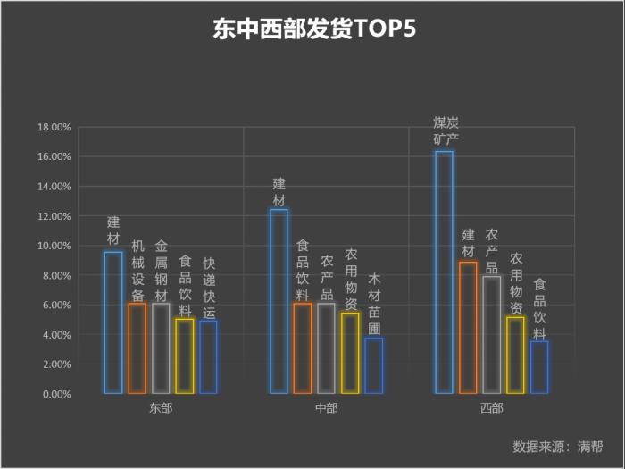 在货品丰富程度上,东部发货类型相对更为多元化,既有建材、机械,又有食品饮料及快递快运,反映出其产业与经济的多元化。