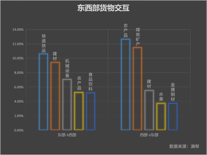 东西部通过货运产生了怎样的交互?东部发往西部的前5类货品分别是快递快运搬家、建材、机械设备、农产品和食品饮料,西部发往东部的前5类货品分别是农产品、煤炭矿产、建材、水果和金属钢材。总体看,西部往东部输送原材料,东部向西部输送深加工以及消费类产品,满足西部的消费需求。