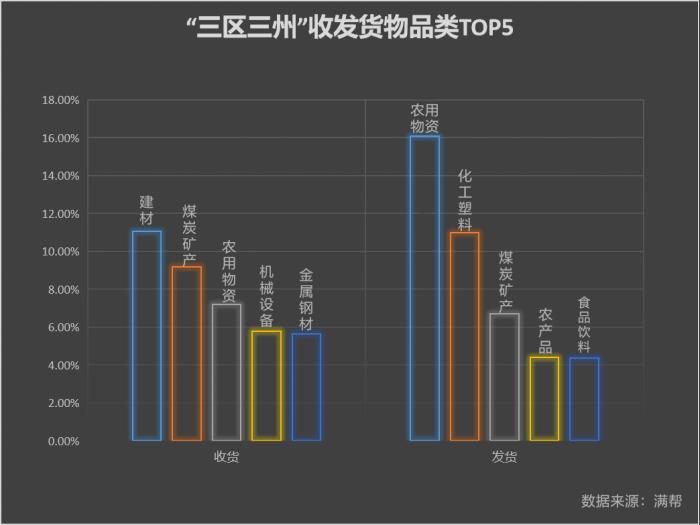 “三区三州”主要生产什么,又需要什么?该区域发货前5分别为农用物资、化工塑料、煤炭矿产、农产品和食品饮料,以第一产业与原材料为主;收货前5则分别为建材、煤炭矿产、农用物资、机械设备和金属钢材。