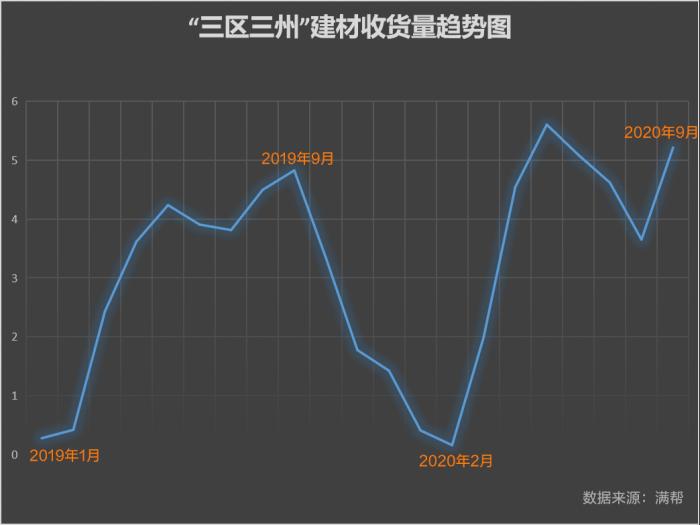 我国是基建大国,加之近年来城市化进程不断加速,带来大量建材运输需求。满帮大数据显示,建材在各地收货比例几乎都位列第一,“三区三州”呈现出同样的特点,建材收货占比位居首位,高达11.08%,高于西部平均的10.32%。2019年至今,除疫情影响之外,建材的收货量一直处上升态势。