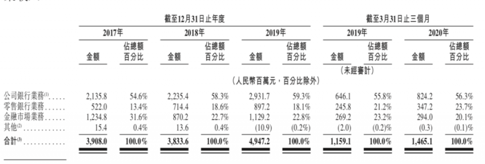 2017年至2019年,威海银行来自于公司银行业务的收入分别为21.36亿元、22.35亿元、29.32亿元,分别占同期营收总额的54.6%、58.3%、59.3%。