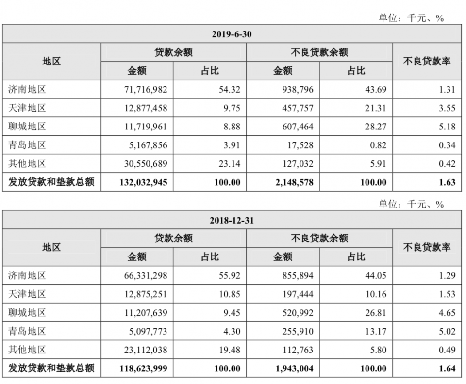 齐鲁银行在天津地区和聊城地区的不良率较高。2019年6月末、2018年末、2017年末及2016年末,天津地区不良贷款占不良贷款总额的比例分别为21.31%、10.16%、34.33%、58.89%,天津地区不良贷款率分别为3.55%、1.53%、3.58%及6.00%。