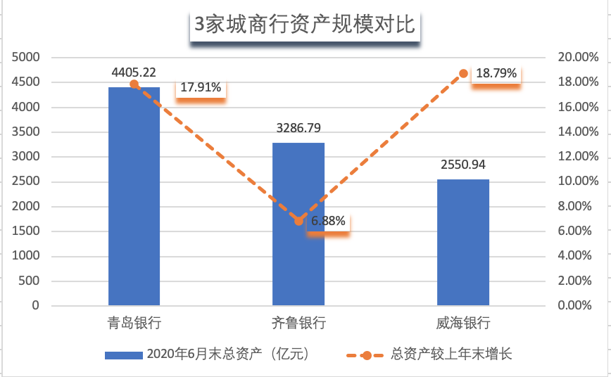 2020年上半年,从总资产看,青岛银行、齐鲁银行、威海银行分别为4405.22亿元、3286.79亿元、2550.94亿元。