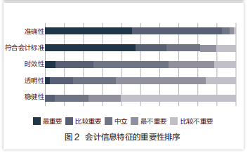 一是财务信息披露。包含会计信息特征、披露财务信息考虑的因素、季度利润目标设置和季度利润参考指标。上市公司对于会计信息特征的追求决定其信息披露的内容及质量。结果显示,准确性和符合会计标准是中国上市公司最为看重的两个会计信息特征(见图 2)。在做财务信息披露的决定时,所有公司都会考虑信息披露是否合规,除此之外还注重信息披露是否会对股票价格(79%)和声誉(75%)有影响。只有 51% 的上市公司表示会设置季度利润目标,在设置季度利润目标时,最为重要的指标参考是上一年同季度的利润,并非常关注季度利润是盈利还是亏损(81%)。