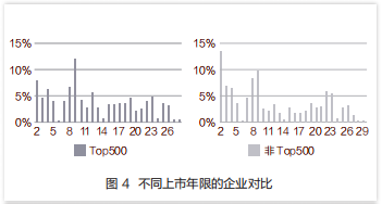 从行业分布来看,Top500 公司中,制造业占绝大多数,超过了 50%,这与制造业公司基数大有关。卫生与社会工作、金融业、采矿业、农林牧渔业和建筑业的公司平均指数得分较高。从产权性质来看,Top500 公司中,有 45% 是民营企业,平均指数得分为 3 .08 ;55% 为国有企业,平均指数得分为 3 .18。从上市交易所来看,Top500 公司中,有 246 家在上海证券交易所上市,其余 254 家在深圳证券交易所上市,这其中有 300 家在主板上市,124 家在中小板上市,76 家在创业板上市。主板上市的企业平均指数得分较高,为 3 .16,中小板和创业板公司的平均指数得分接近,为3 .07。从上市时间看,年轻的公司和较老的公司均在 Top500 公司中有所分布。Top500 公司平均上市年限为 12 .4 年,非 Top500 公司平均上市年限为 11.7,略低于 Top500 公司(见图 4)。