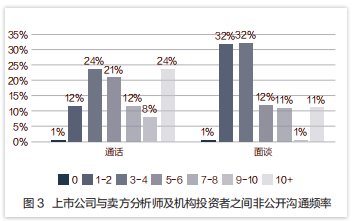 在利益相关者的框架下,企业和重要利益相关者的信息交流并不完全依赖公开的信息披露,非公开的沟通也可能是一种重要途径。一方面,更多的非公开沟通能够提供给投资者和重要利益相关者更多关于上市公司的信息,提高公司的信息环境 ;另一方面,这一途径很有可能造成机构投资者和中小投资者之间的信息不对称,使得中小投资者处于信息劣势。为评估这一沟通渠道的影响,我们特别调查了上市公司与卖方分析师及机构投资者之间非公开沟通的频率(见图 3)。上市公司几乎一致认为,卖方分析师对公司信息的传播有作用。在肯定卖方分析师作用的公司中,46% 提到他们能够提供对公司更加专业的解读,帮助投资者更好地了解公司。