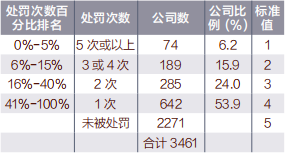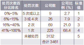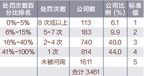 各公司在过去 8 年(2011-2018)中公开的监管处罚记录和问询函记录。监管处罚记录包括虚假记载(误导性陈述)、披露不实、推迟披露、重大遗漏、利润虚构、虚列资产等。监管机构包括中国证监会、地方证监局、上海和深圳证券交易所等。数据来自国泰安数据库(CSMAR)。监管处罚分为非罚款 类 处罚和罚款类处罚,分别占监管问询得分的 25%和 50%,问询函记录占监管问询得分的 25%。由于监管部门进行调查、采取监管措施或处罚之间存在时滞,我们在 2019 年指数完成前持续监控,对于公司出现重大负面事件且受到监管部门重点关注的公司,我们将其监管问询得分降为 1。