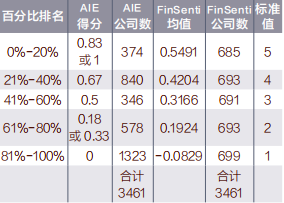对 2018 年所有 WiseNews 中文报纸媒体文章做的大 数据智能分析。由以下两个指标取均 值 :智能评估(AIE)和财经舆情(FinSenti)。