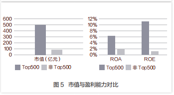 从市值 来 看,Top500 公司 在 市值 上 要远大于其他企业,平均市值分别为 496 亿元和 74 .5 亿元,如图 5 所示。从盈利能力来看,Top500 公司的平均总资产收益率(ROA)比非 Top500 公 司 高 出 4 .4%, 净 资 产 收 益 率(ROE)的差距更大,相差近 10%。