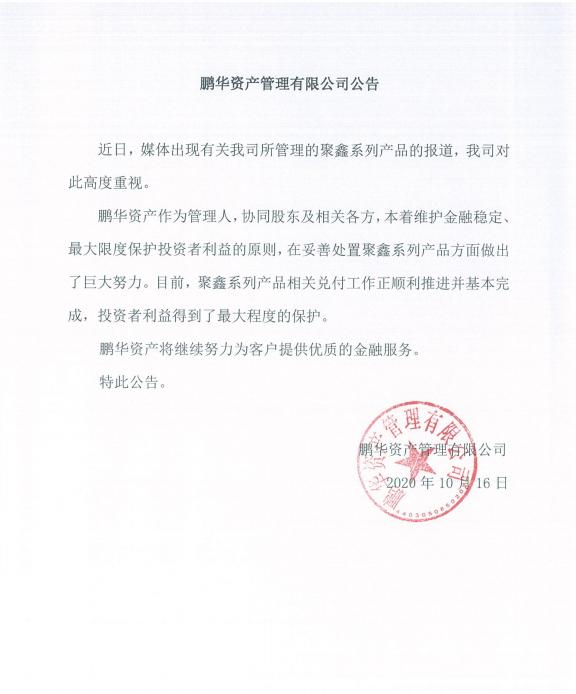 16日晚间,鹏华资产管理有限公司在官网发布公告称,近日媒体出现有关我司所管理的聚鑫系列产品的报道,我司对此高度重视。鹏华资产作为管理人,协同股东及相关各方,本着维护金融稳定、最大限度保护投资者利益的原则,在妥善处置聚鑫系列产品方面做出了巨大努力。目前,聚鑫系列产品相关兑付工作正顺利推进并基本完成,投资者利益得到了最大程度的保护。