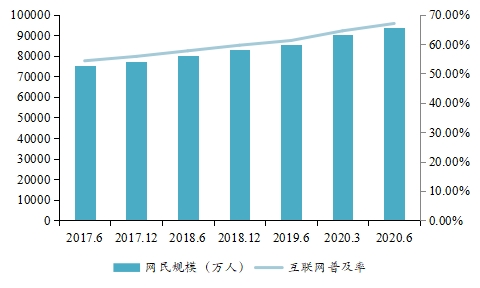 截至2020年6月,我国网民规模为9.40亿,较2020年3月新增网民3625万,互联网普及率达67.0%,较2020年3月提升2.5个百分点;9.40亿规模的网民中农村网民规模为2.85亿,占整体网民的30.4%,农村网民相较2020年3月增长3063万,城镇网民相较2020年3月增长562万,说明互联网用户的渗透率的增长领域主要集中在农村网络用户。