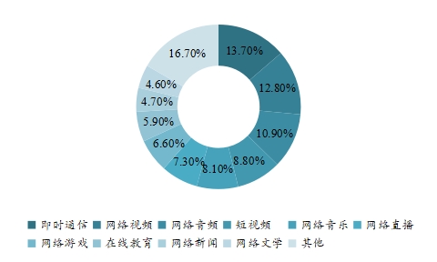 2020年3月的数据:手机网民经常使用的各类App中,即时通信类App的使用时间最长,占比为14.8%;网络视频(不含短视频)、短视频、网络音频、网络音乐和网络文学类应用的时长占比分列第二到六位,依次为13.9%、11.0%、9.0%、8.9%和7.2%。短视频应用时长较上期同比增加2.8个百分点,增长明显。2020年6月,手机网民经常使用的各类App中,即时通信类App的使用时间最长,占比为13.7%;网络视频、网络音频、短视频、网络音乐和网络直播类应用的使用时长占比分列二到六位,依次为12.8%、10.9%、8.8%、8.1%和7.3%。我们可以看到视频行业包含的网络视频、短视频、网络直播合计占据互联网使用时长的28.9%。