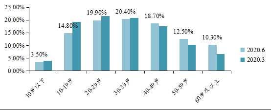 上图中,外圈是截至2020年一季度的数据,截至2020年6月,我国网民男女比例为51:49,与整体人口中男女比例51.1:48.9基本一致。对比两期时间段对应的数据,我们可以清晰的发现在2020年二季度女性网民的比例有所增加,而且在新增网民中女性网民占主导地位。