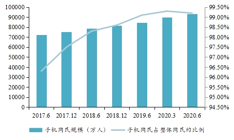截至2020年6月,我国手机网民规模为9.32亿,相较2020年3月新增手机网民3546万,网民中使用手机上网的比例为99.2%,相较2020年3月基本持平。结合互联网用户新增人数3625万,手机网民增长占总网络用户新增的比率为97.82%。结合我国网民使用互联网所用设备的数据:截至2020年6月,我国网民使用手机上网的比例达99.2%,使用台式电脑、笔记本电脑、电视和平板电脑上网的比例分别为37.3%、31.8%、28.6%和27.5%,说明未来我国网民的增量依然主要由手机网民新增贡献。