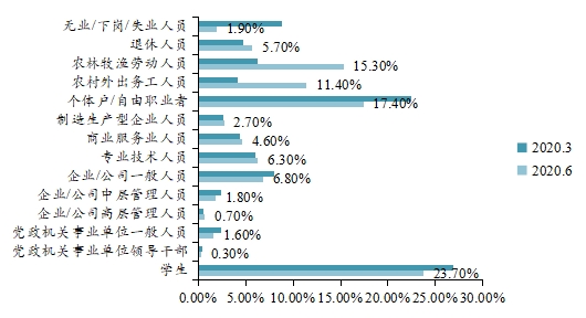 截至2020年6月,在我国网民群体中,学生最多,占比为23.7%;其次是个体户/自由职业者,占比为17.4%;农林牧渔劳动人员占比为15.3%,对比2020年3月更新的数据,我们可以得到农林牧渔劳动人员和农村外出务工人员的比例均发生了较大的增长,说明网民的新增主要是由于互联网向农村渗透造成的,这部分网民的新增降低了其他职业人员占总体网民的比例。