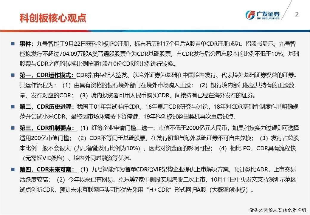 第四,CDR未来可期:(1)九号智能作为首单CDR给VIE架构企业提供上市解决方案,预计类比ADR,上市交易活跃度较高;(2)今年以来已有网易、京东等7家中概股实现港股二次上市,10月11日中央发文支持深圳示范区试点创新CDR,预计未来互联网巨头可能优先采用“H+CDR”形式回归A股(大概率创业板)。