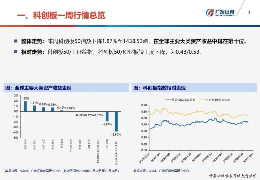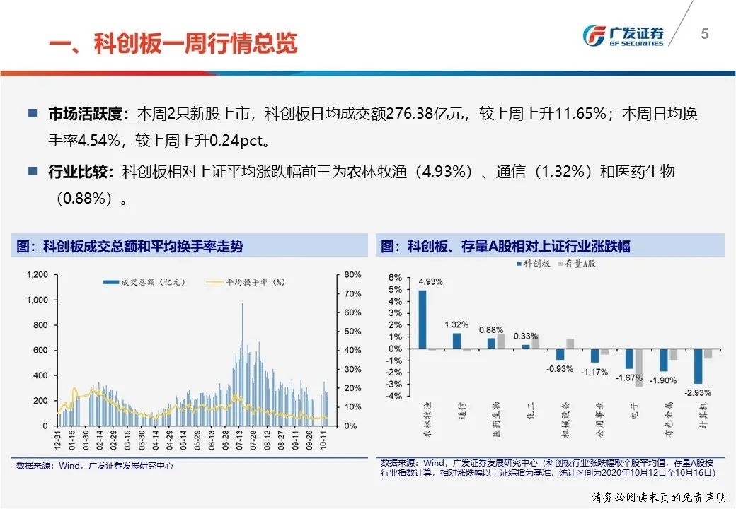 一周行情总览:①科创板50指数本周下降1.87%至1438.53点;②本周日均成交额276.38亿元,较上周上升11.65%;本周日均换手率4.54%,较上周上升0.24pct。