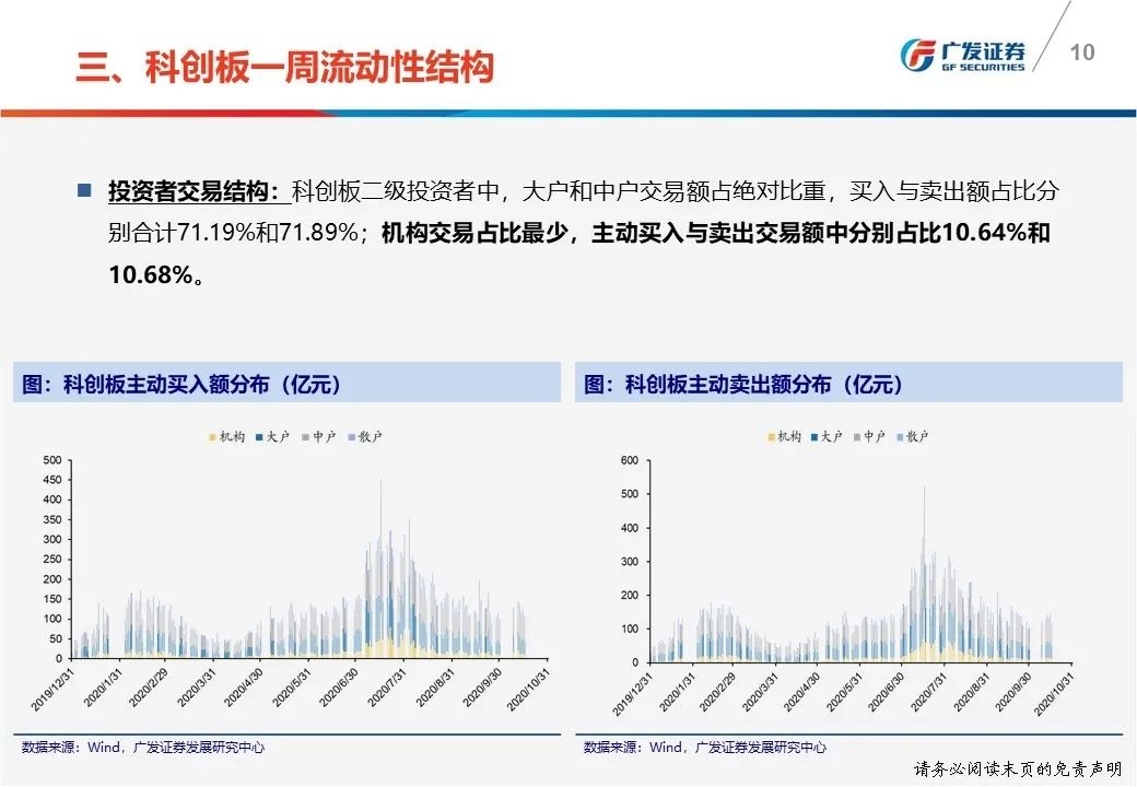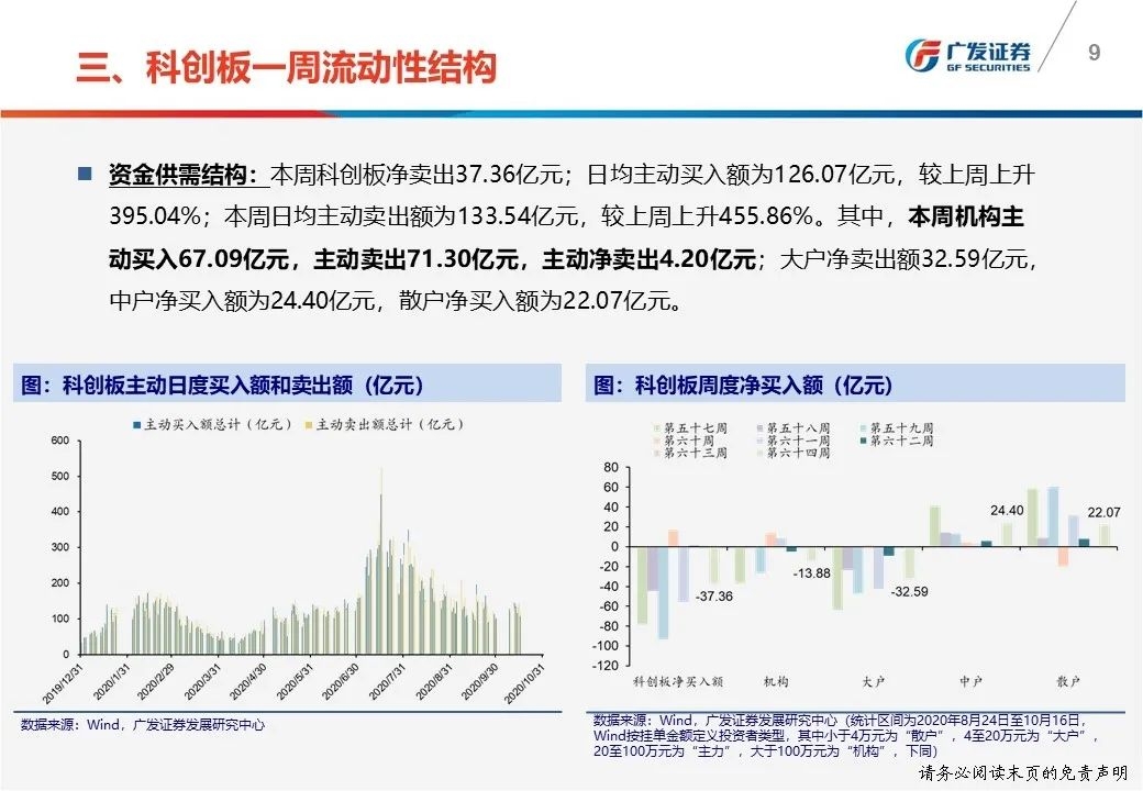 一周流动性结构:①本周科创板净卖出37.36亿元,机构主动净卖出4.20亿元;②机构本周主动买入与卖出交易额中分别占比10.64%和10.68%;③本周四融券余额为99.04亿元,相较上周五上升10.16%,融券/融资余额比为0.33。
