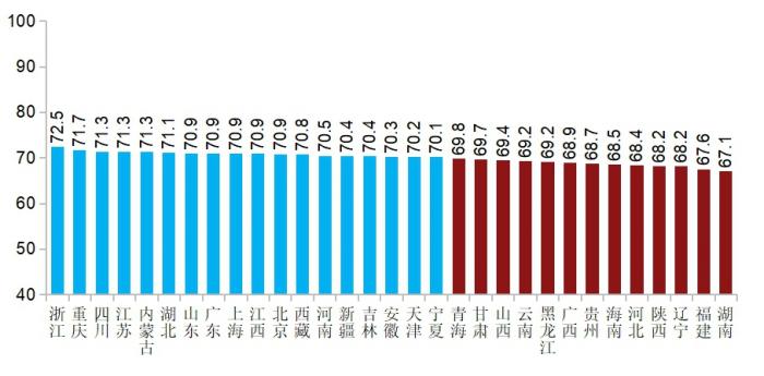 18个省份的得分在平均分(70.0分)及以上,包括:浙江、重庆、四川、江苏、内蒙古、湖北、山东、广东、上海、江西、北京、西藏、河南、新疆、吉林、安徽、天津、宁夏,其余13个省份的得分均在平均分以下。