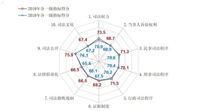 司法文明指数共包括10个一级指标。其中,“司法公开”已连续多年得分最高(75.9分),“司法腐败遏制”得分最低(66.501分)。