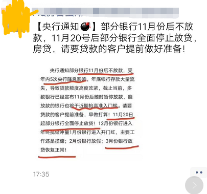 另外,南方楼事咨询了数家银行个贷人士,得到的回应均是:假得离谱,不可能全面停止放贷,还持续几个月。