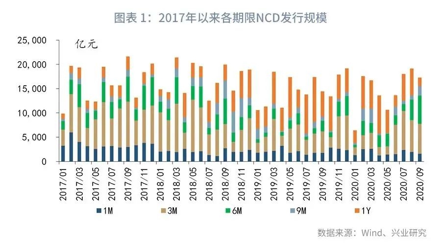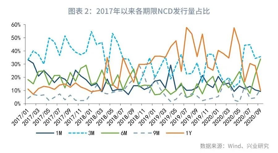 2018年下半年以来,1年期NCD的单月发行规模和占比在各期限NCD中明显提升,自那时起,1年期NCD的单月发行规模通常在3000亿元以上,占比保持在30%以上。