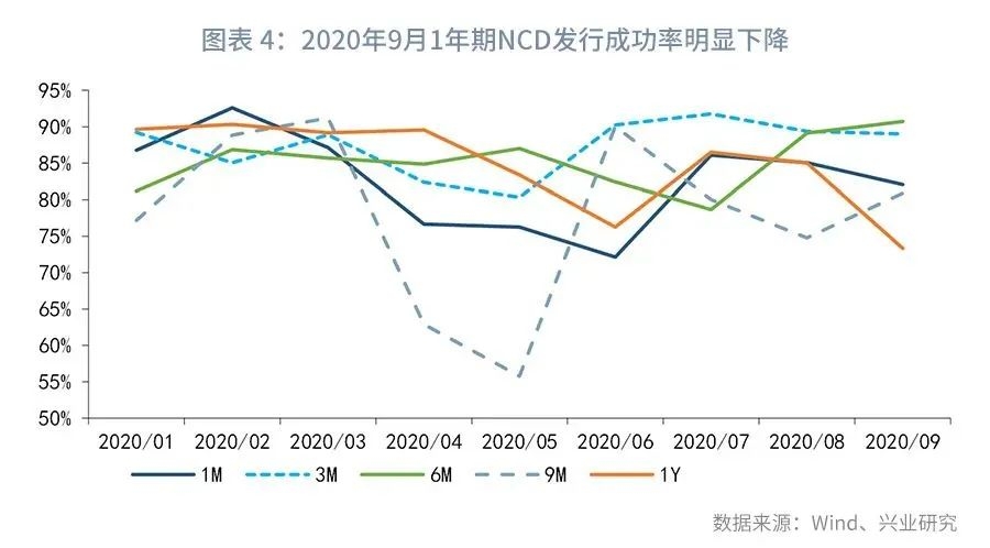 那么,为何近期1年期NCD的发行规模锐减呢?观察NCD发行成功率(实际发行规模/计划发行规模)指标,2020年9月,1年期NCD的发行成功率仅为73%,是2020年以来的最低水平,也明显低于其他期限NCD。可以看出,9月份以来,1年期NCD的发行难度明显上升。这可能说明,近期1年期NCD发行规模的下降,主要是因为投资者对于1年期NCD的偏好下降导致的。
