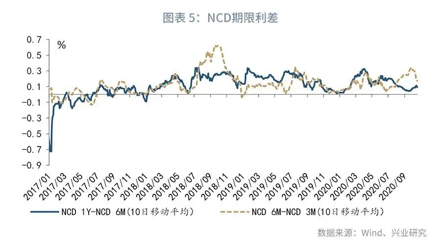 这主要是因为,2018年5月23日,银保监会发布了《商业银行流动性管理办法》,要求银行逐步执行NSFR指标,其中,中央银行和金融机构提供的剩余期限在6个月到1年的融资在分子中适用50%的权重,中央银行和金融机构提供的剩余期限在6个月以内的融资适用0%的权重,因而商业银行对长期负债的需求上升,从可供选择的NCD品种来看,9个月和1年期NCD可以较好的满足上述需求;而且,这种由于监管指标导致的长期负债需求较为刚性,不随着市场利率的变动而改变,这也意味着,商业银行需要对1年期NCD付出额外的期限溢价。