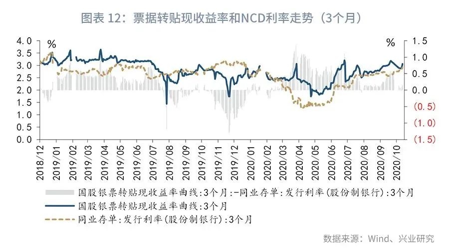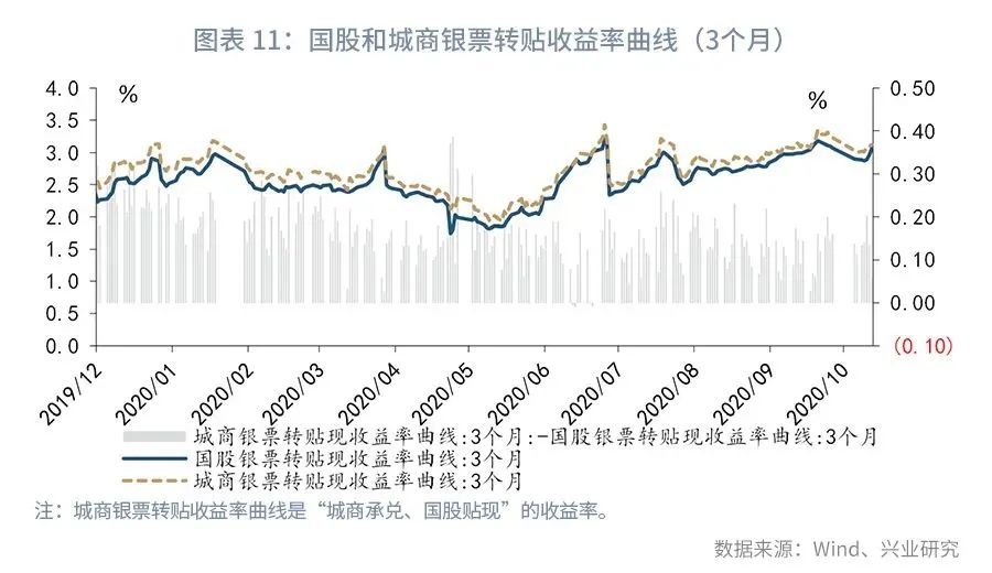 从不同承兑主体的票据转贴现收益率来看(图表11),10月16日,3个月国股和城商银票转贴收益率分别为3.06%和3.12%,利差为6bp。