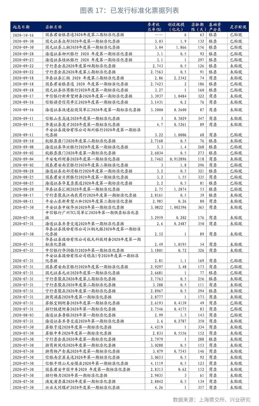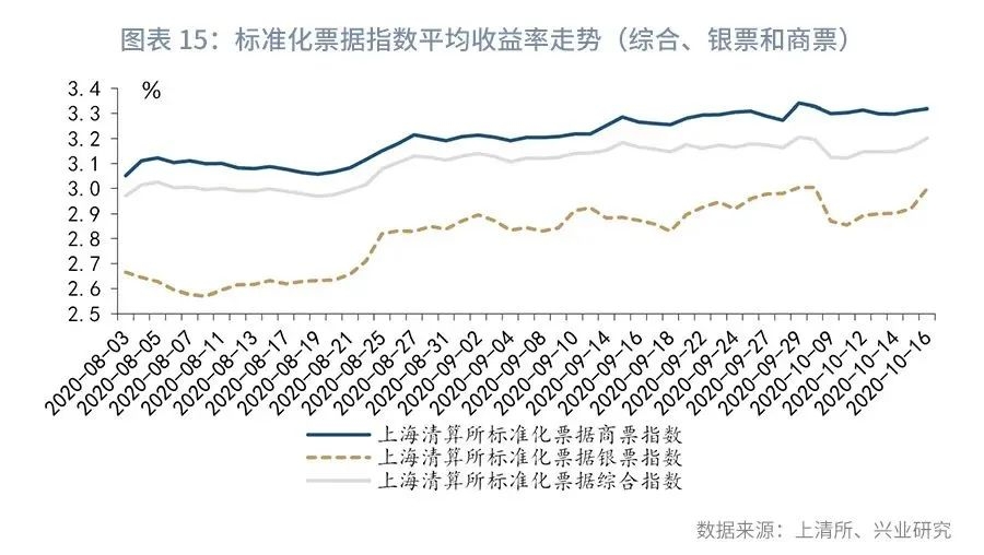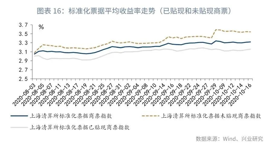 从标准化票据的发行来看,国庆节后标准化票据发行1单(图表17)。截至10月16日,标准化票据综合指数、银票指数和商票指数的平均收益率分别为3.20%、3.00%和3.32%,综合指数和银票指数收益率与上月末持平,商票指数收益率下行1bp(图表15);已贴现商票和未贴现商票平均收益率分别为3.54%和3.16%,较上月末分别上行1bp和下行4bp(图表16 )。