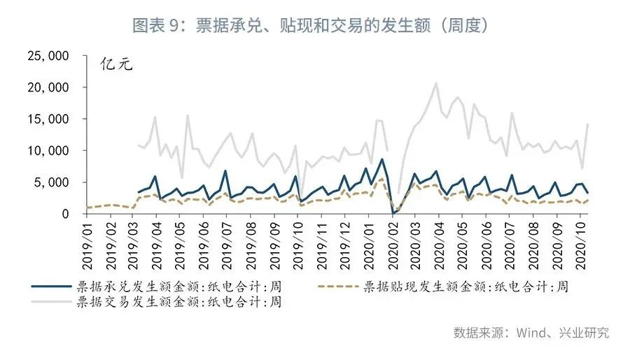 从票据市场的一级和二级交易规模来看(图表9),10月国庆假期后票据市场开票较少,交易较为活跃,10月9日-15日票据承兑发生额为3346亿元;票据贴现发生额为2129 亿元;票据交易(含转贴现、质押式回购和买断式回购)发生额为14082亿元。