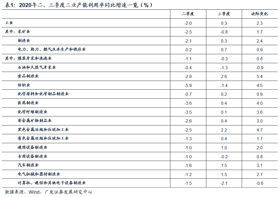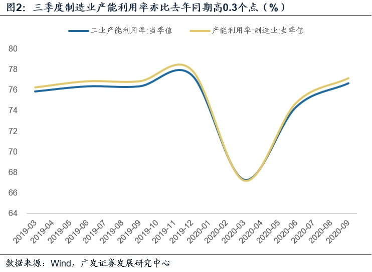 三季度全国工业产能利用率为76.7%,比上年同期上升0.3个百分点。其中采矿业产能利用率比二季度上升1.8个百分点,但仍比上年同期下降0.8个百分点;制造业产能利用率为77.2%,比二季度上升2.4个百分点,比上年同期上升0.3个百分点。同比抬升明显的包括食品制造(2.6个点)、黑色金属(2.2个点)、通用设备(1.0个点)、汽车(1.5个点)、电气机械(1.5个点)等行业。如果进一步对比二季度,还要再加上纺织(同比-1.4个点,但较二季度提升4.5个点)、化纤(同比0.1个点,但较二季度提升3.6个点)。