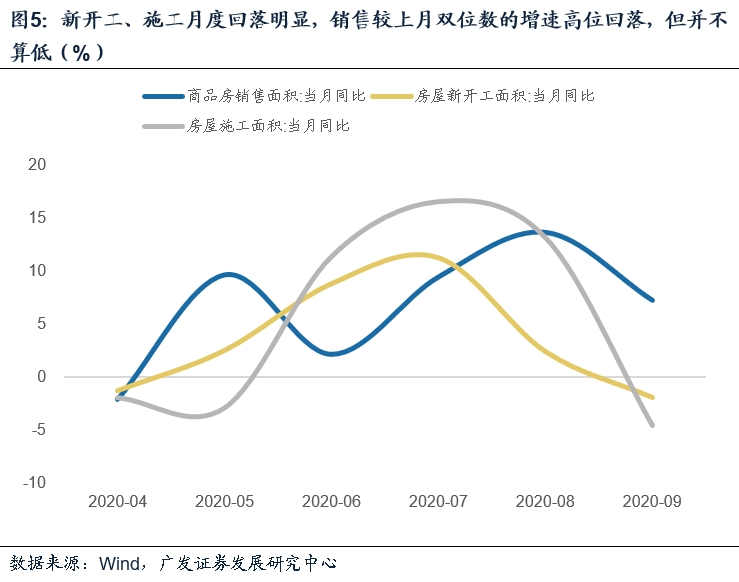 新开工、施工单月增速分别为-2.0%、-4.6%,较上月回落明显。这里面有一定基数影响,施工去年的增速高峰是9月和10月;基数外是否包含趋势性因素则有待进一步观测。