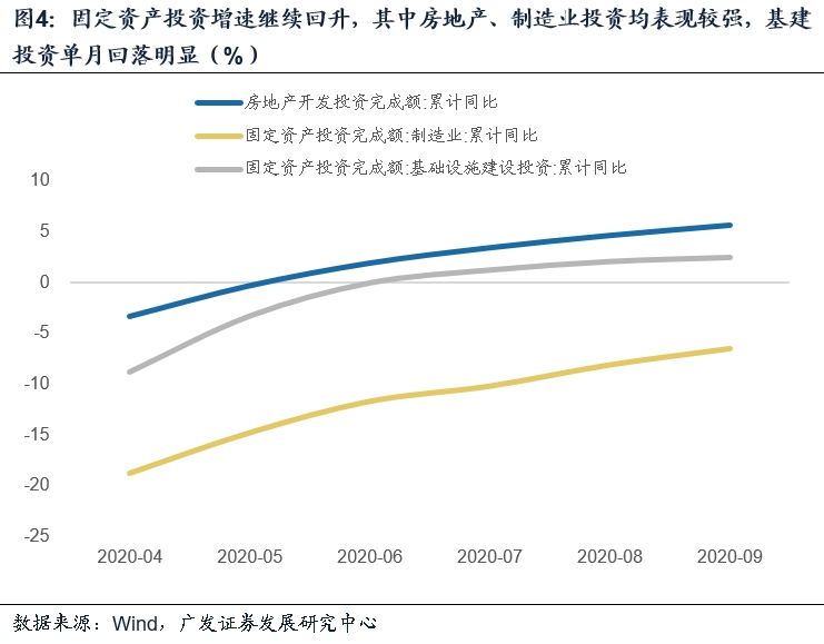 9月固定资产投资累计增速为0.8%,较上月的-0.3%进一步走升。其中制造业投资累计增速为-6.5%,较上月-8.1%进一步收窄1.6个点;房地产投资累计增速为5.6%,较上月进一步上升1.0个点。