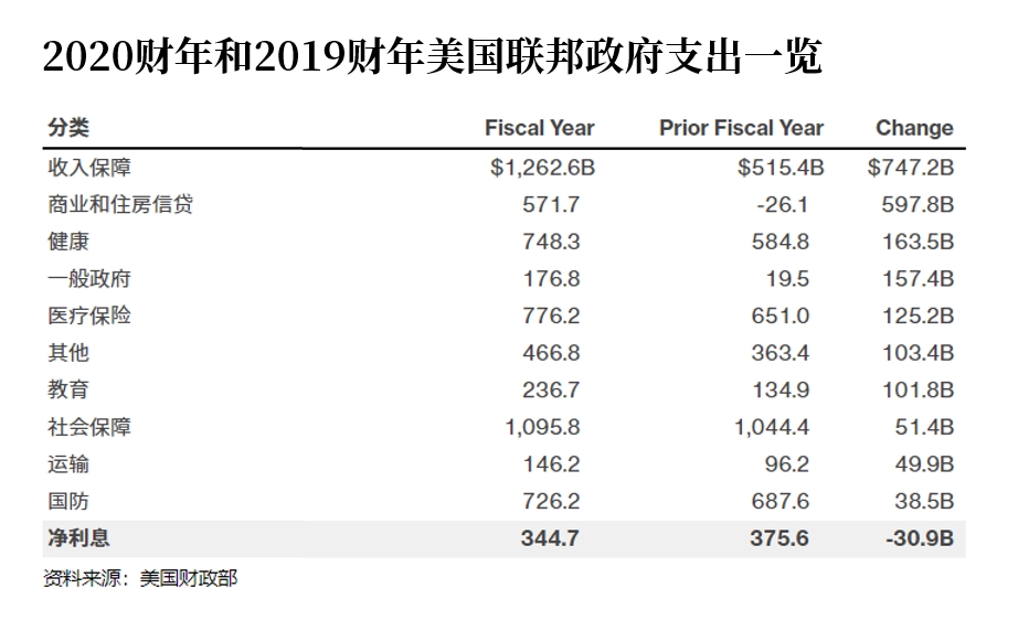 查看美国政府2020财年的支出详情可以发现,增加的支出主要用来发放失业补助和支持中小企业。