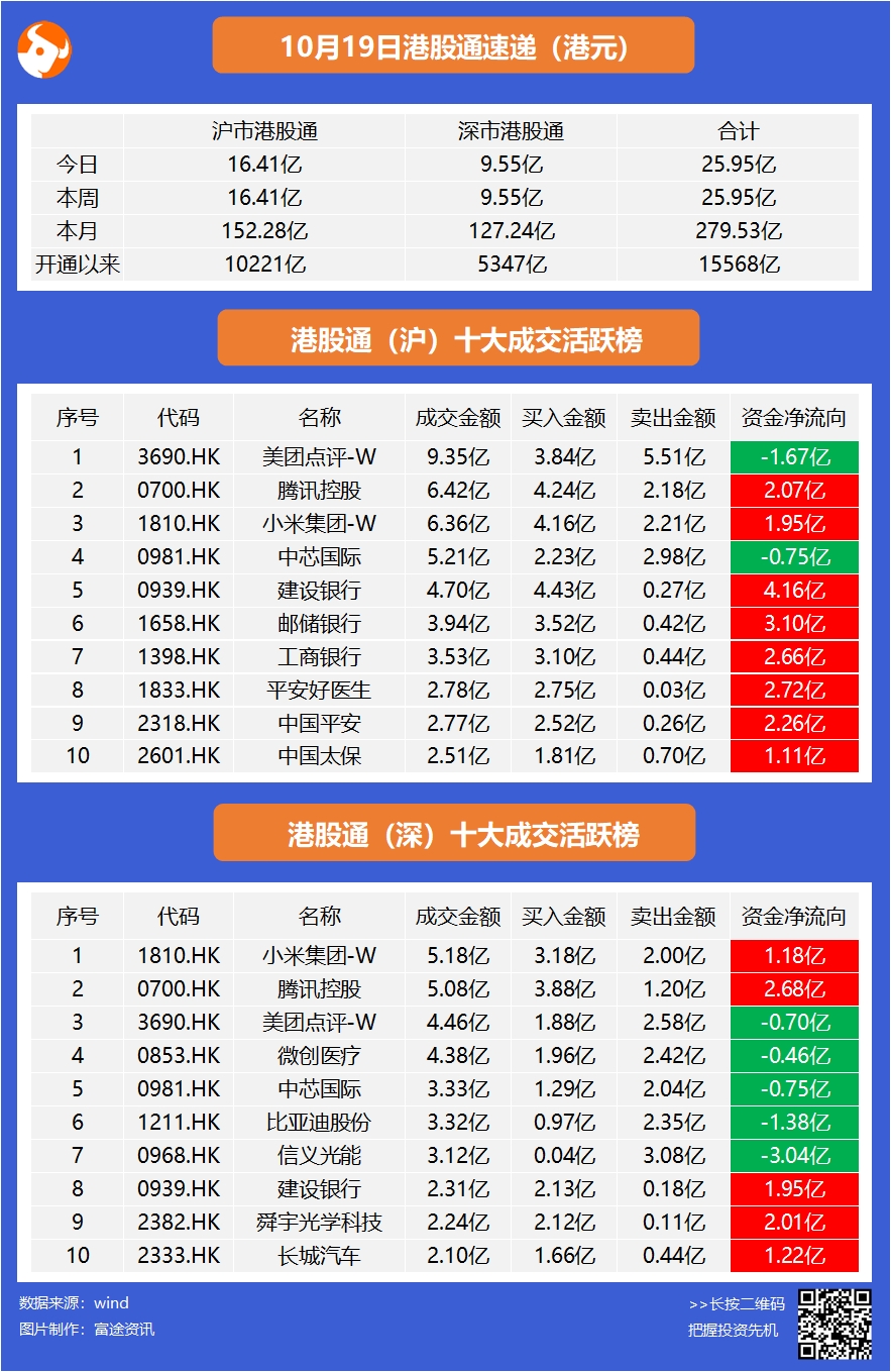 根据Wind数据显示,南下资金今日净流入25.95亿港元。其中,净买入建设银行6.11亿港元,腾讯控股4.74亿港元,邮储银行3.10亿港元,小米3.13亿港元,工商银行2.66亿港元。