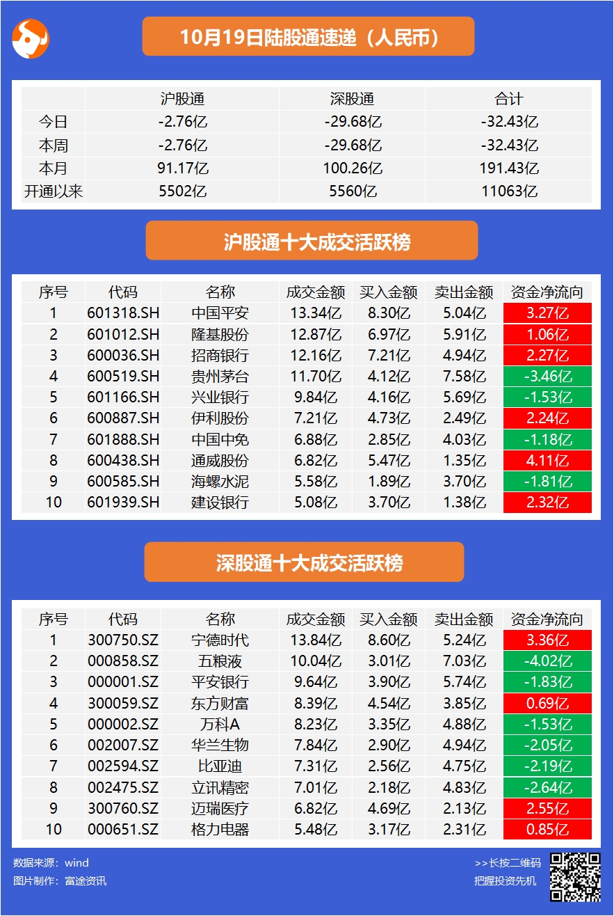 通威股份、宁德时代、中国平安、迈瑞医疗净买入居前,分别获净买入4.11亿元、3.36亿元、3.27亿元、2.55亿元。