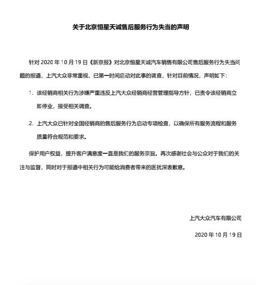 10月19日晚间,上汽大众汽车有限公司发布声明称,针对当日《新京报》对其北京某经销商4S店售后服务行为失当的报道,已启动调查,并已责令该经销商立即停业。