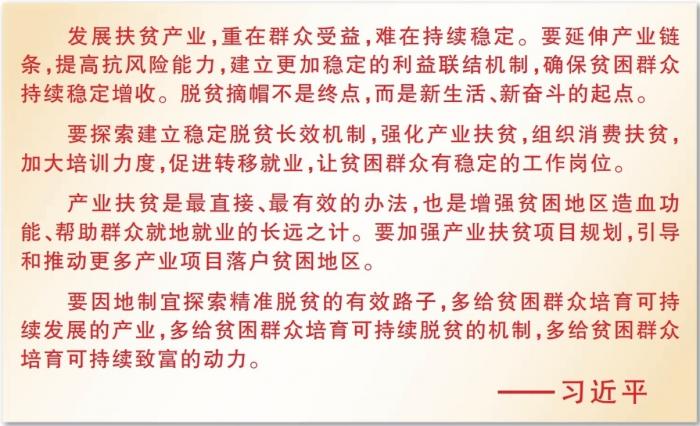 一系列强有力的政策举措落地生根,一大批特色产业在贫困地区拔节成长。产业兴了,村民富了,山村活了,832个贫困县每个县都有了主导产业,90%的贫困人口参与富民产业,日子越过越红火。