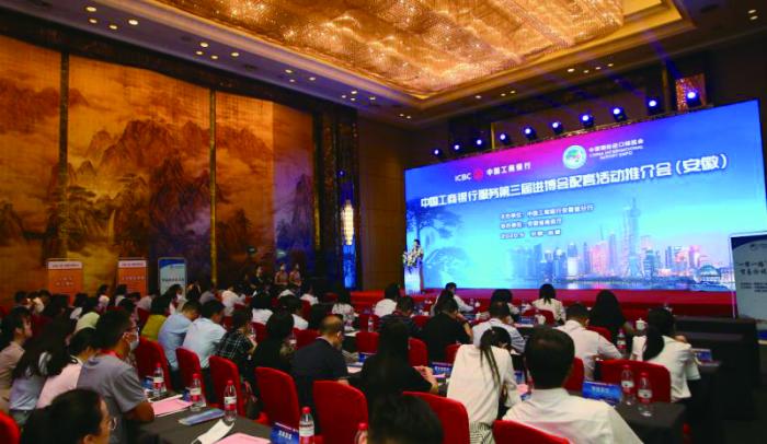图为工行举办的第三届进博会配套活动推介会(安徽站)。