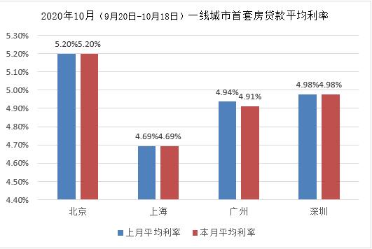 2020年10月(数据监测期为2020年9月20日-2020年10月18日),一线城市中,北上深三地继续维持上期房贷利率水平,广州地区4家银行调低了首套房贷款利率,进而带来整体水平再次下降,环比降幅为3BP,二套房利率不变。
