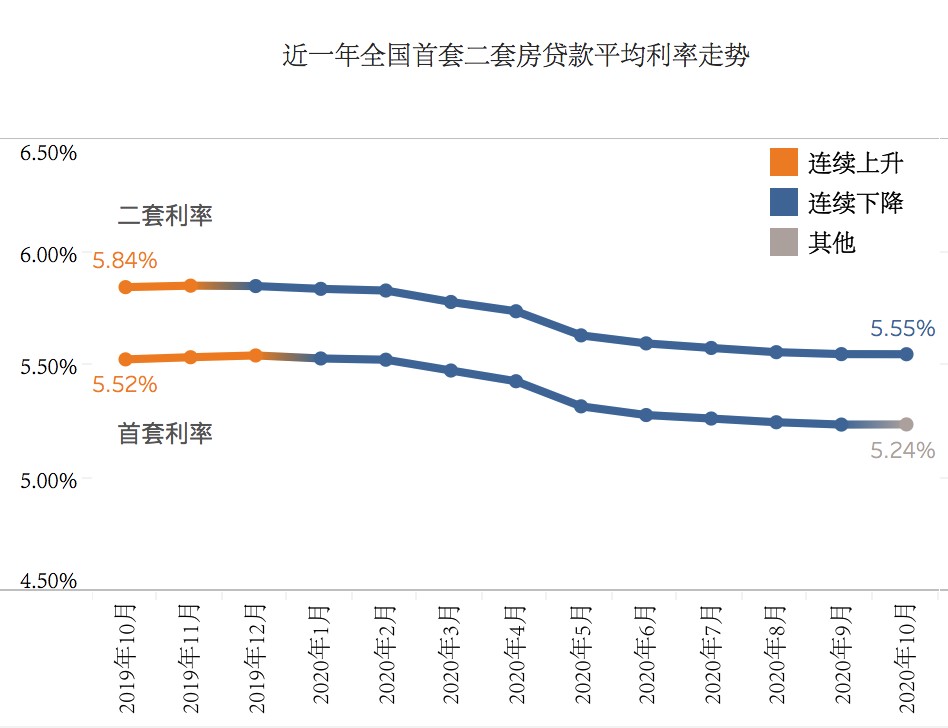 融360大数据研究院对全国41个重点城市674家银行分支机构房贷利率的监测数据显示,2020年10月(数据监测期为2020年9月20日-2020年10月18日),全国首套房贷款平均利率为5.24%,二套房贷款平均利率为5.55%,均与上月持平。今年以来房贷利率九连降的趋势终结,拐点出现。
