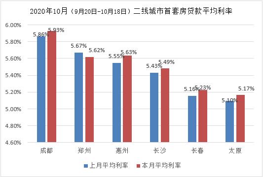 2020年10月(数据监测期为2020年9月20日-2020年10月18日),虽然仍有14个城市的房贷利率平均水平呈现下降趋势,但下降幅度都比较小,降幅最大的为郑州地区,较上期下降了5BP;上升的城市中,惠州、太原、长春、成都、长沙5地的环比涨幅都超过5BP。其中长春地区继上月环降17BP后,本月又回调7个BP;成都地区则持续三连涨,本月涨幅为7BP,累计涨幅为18BP。